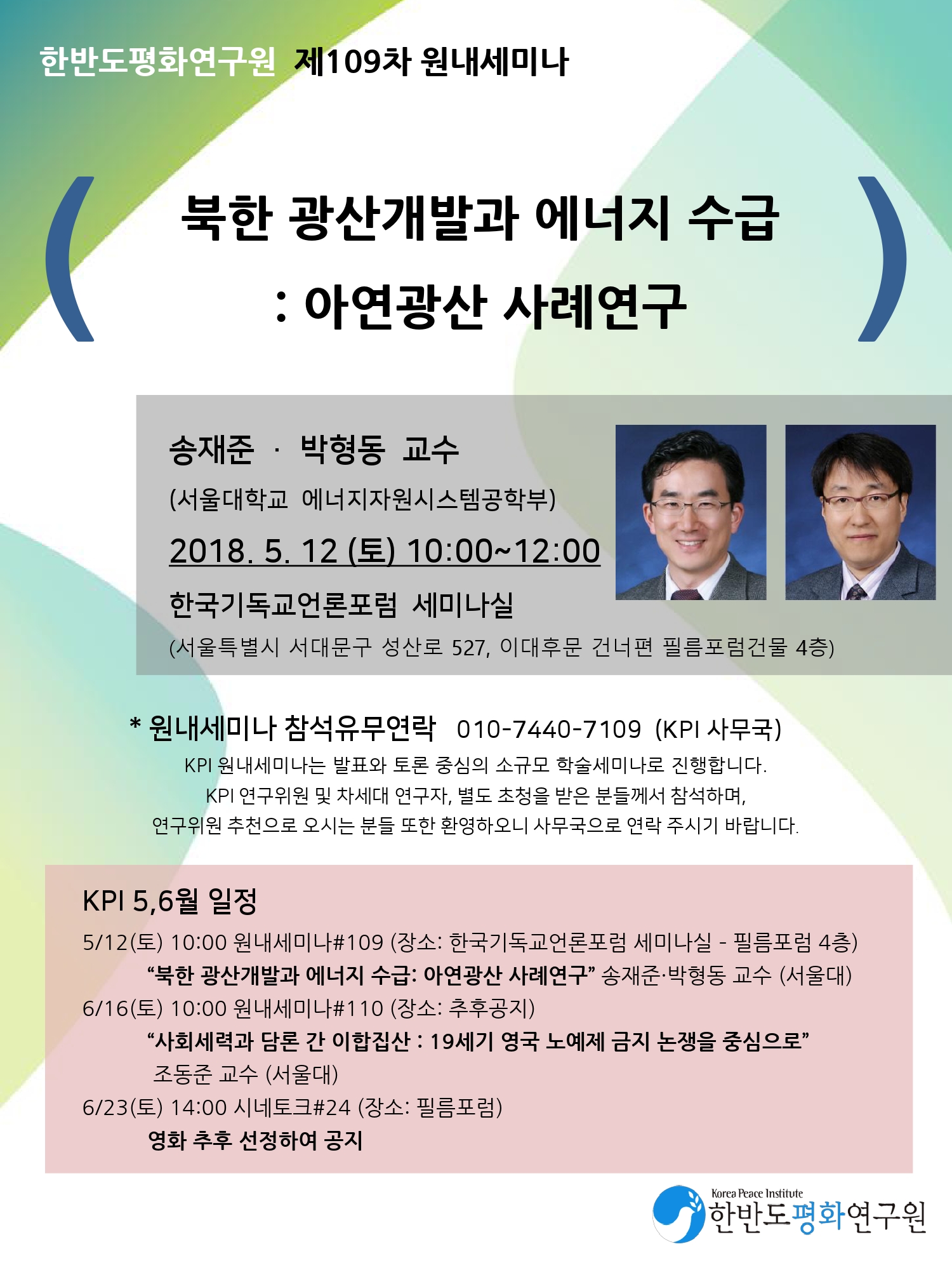 KPI 원내세미나의 경우 KPI 연구위원 및 신진학자, 차세대 모임 회원을 중심으로 발표와 토론 중심의 소규모 학술세미나로 진행합니다. 이에 발표문 전문을 공개 홈페이지에 탑재하지 않고 있습니다. 양해부탁드립니다. - KPI 사무국 ---------------------------------------------- 한반도평화연구원 제109회 원내세미나 제목: 북한 광산개발과 에너지 수급 : 아연광산 사례연구 발표자 : 송재준 (서울대학교 공과대학 에너지자원공학과 교수) 박형동 (서울대학교 에너지자원신기술연구소 소장) 일시 : 2018년 5월 12일(토) 오전 10:00 발표내용 목차 1. 서론 2. 분석대상선정 2.1 아연 광석 2.2 검덕 광산 3. 경제성 평가 및 민감도 분석 3.1 경제성 평가 3.2 민감도 분석 4. 지질재해 위험성 평가 4.1 사면안정성 평가 4.2 홍수 위험지역 평가 5. 태양광 발전부지 평가 5.1. 태양광 발전 부지 평가의 필요성과 방법 5.2 태양광 발전 부지 평가 결과 5.3 발전부지의 태양광 발전량 예측 6. 지역별 에너지 공급을 위한 에너지 믹스 |