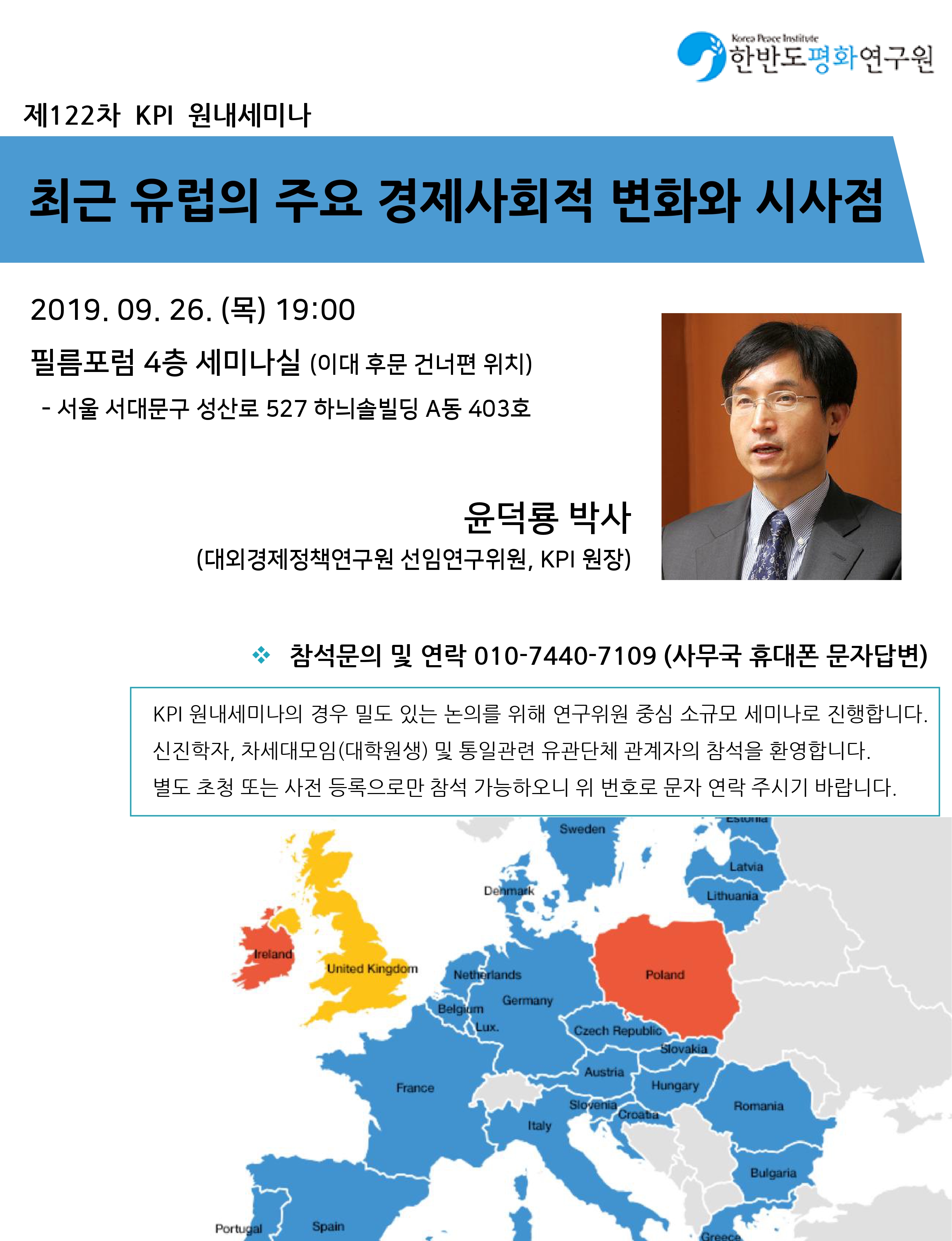 주제 : 유럽의 주요 사회경제적 현안과 시사점 발표자 : 윤덕룡 박사 ( 대외경제정책연구원 선임연구위원, KPI원장) 일시 : 2019년 9월 26일(목) 19:00