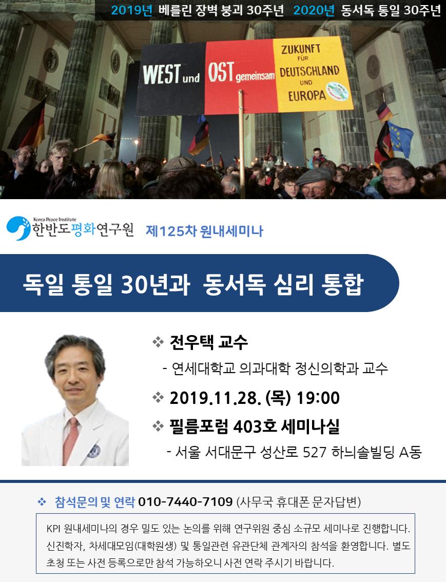 주제 : 독일통일 30년과 동서독 심리통합 발표자 : 전우택 교수 ( 연세대 의과대학, 전 한반도평화연구원 원장) 일시 : 2019년 11월 28일(목) 19:00