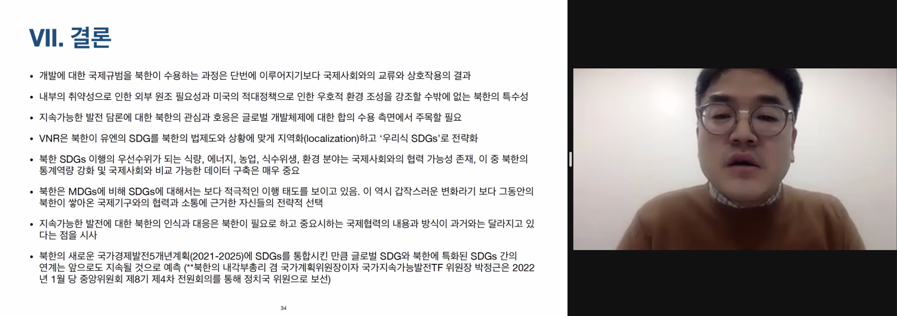 VNR보고서. 실제로 북한이 SDGs를 추진해왔다는 내용들. 그러나 북한 내부의 국가적 당면 목표와 연계하여 이행. 우리식 SDGs강조 글로벌 SDGs가 북한이 지향하는 사회주의강국건설과 연동. 북한식 재해석 V. '우리식 SDGs'의 이행 딜레마 : '주체'와 '협력' 사이