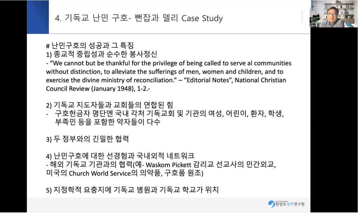(1) 난민 구호의 단계 (2) 난민 구호의 성공과 그 특징 - 종교적 중립성과 순수한 봉사정신 - 기독교 지도자들과 교회들의 연합된 힘 - 두 정부와의 긴밀한 협력 - 난민구호에 대한 선경험과 국내외적 네트워크 - 지정학적 요충지에 기독교 병원과 기독교 학교가 위치 5. 한반도 평화에서의 시사점