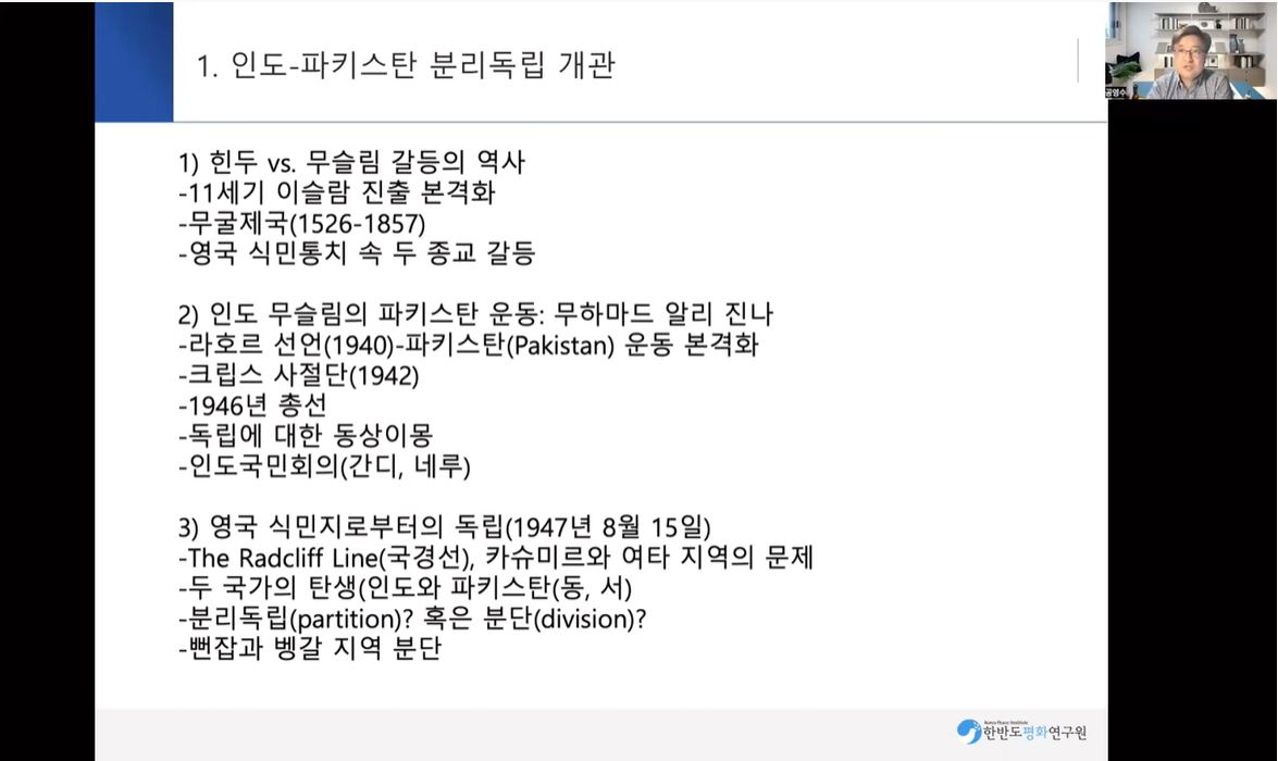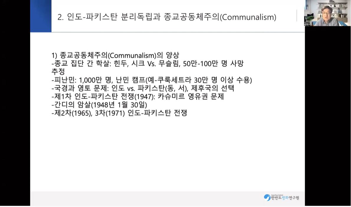 (1) 힌두 vs. 무슬림 갈등의 역사 (2) 인도 무슬림의 파키스탄 운동 : 무하마드 알리 진나 (3) 영국 식민지로부터의 독립 (1947.8.15) 분리독립 (partition) 혹은 분단 (division) 2. 인도 파키스탄 분리독립과 종교공동체주의