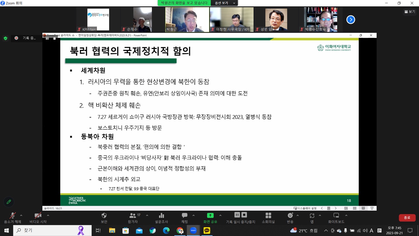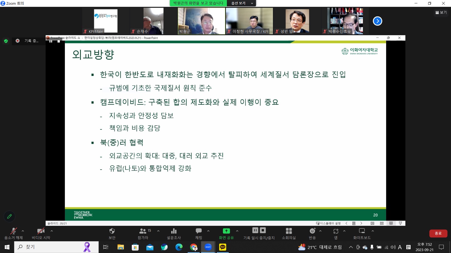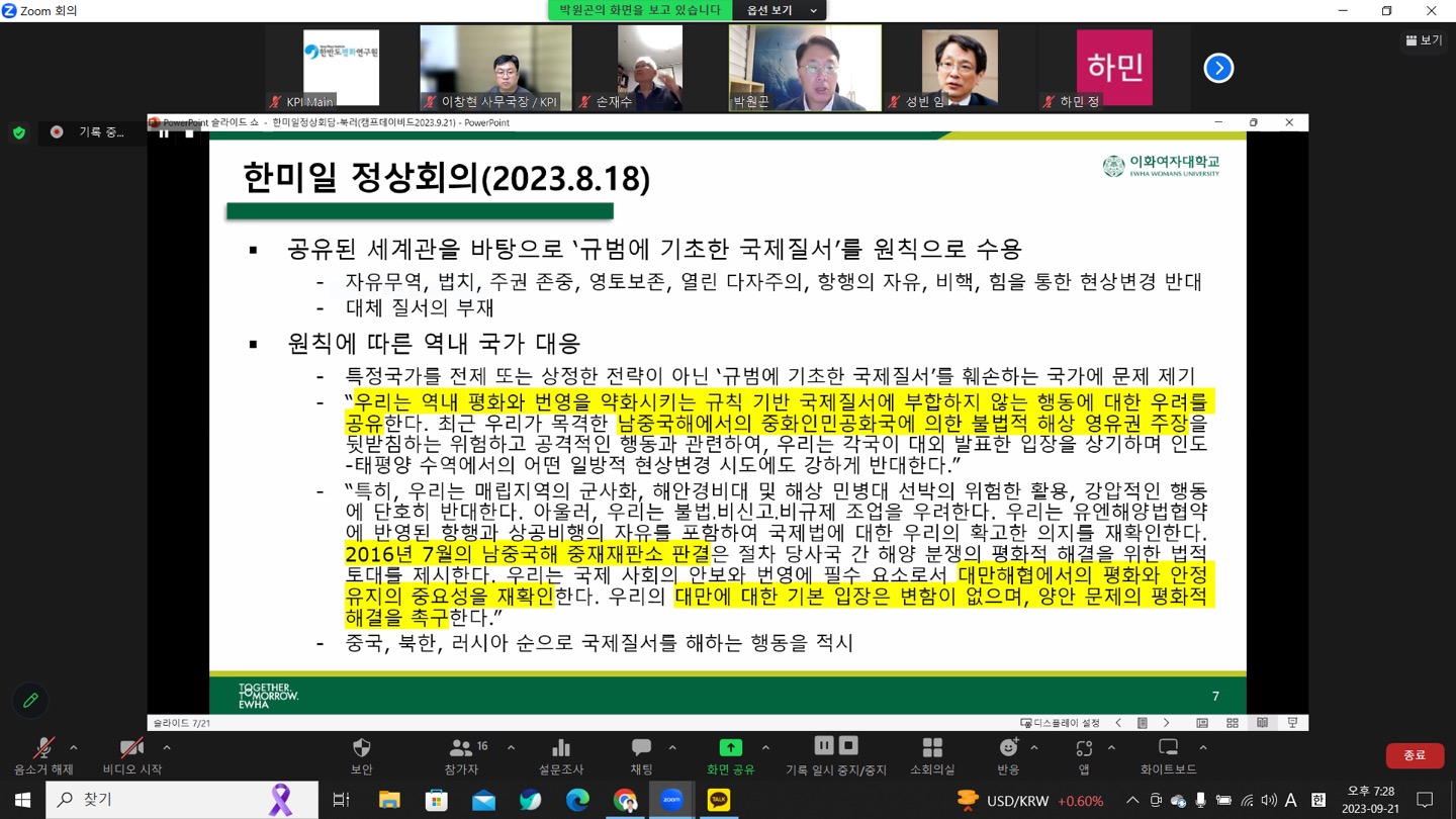 - 규범에 기초한 국제질서. 한반도를 벗어나 세계질서 담론장으로 - 캠프 데이비드: 제도화 이행이 중요 - 북(중)러 협력: 외교공간의 확대(대중, 대러 외교 추진), 유럽(나토)과 통합억제 |