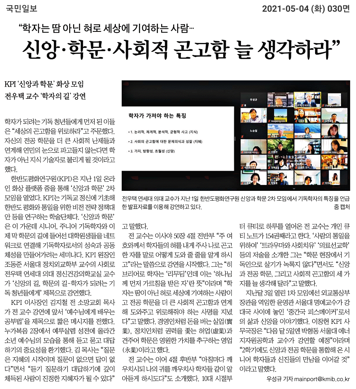 | 제목 | “학자는 땀 아닌 혀로 세상에 기여하는 사람, 신앙·학문·사회적 곤고함 늘 생각하라” [국민 보] |