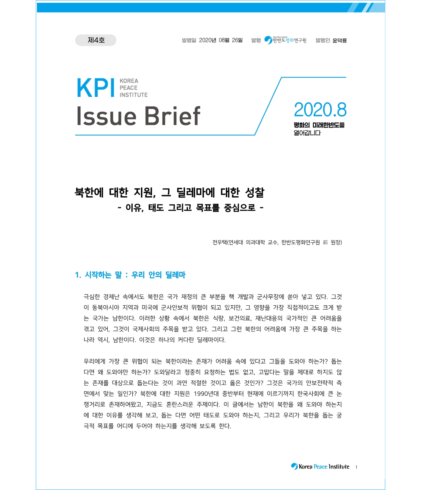 대북제재 및 남북관계 경색으로 북한에 대한 인도적 협력과 대북지원활동이 상당수 멈춘 현재 상황에서, '북한에 대한 지원, 그 딜레마에 대한 성찰'을 주제로 KPI 이슈브리프 제4호가 발간되었습니다.(저자:전우택 연세대 의대 교수, KPI 前 원장)