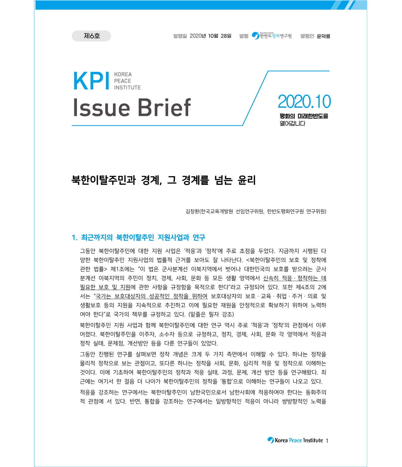 KPI Issue Brief 6호를 발간하였습니다. 미래나눔재단이 의뢰하고 한반도평화연구원이 수행한 북한이탈주민 관련 '경계를 넘는 윤리' 프로젝트 연구책임자인 김창환 선임연구위원(한국교육개발원, KPI연구위원)께서 기고해 주셨습니다.
