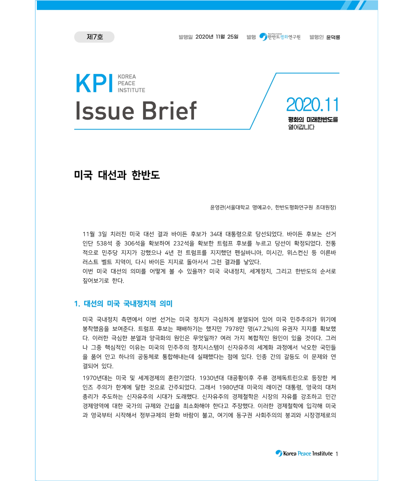 KPI Issue Brief 7호를 발간하였습니다. 미국 대선이 막 끝난 상황에서 '미국 대선과 한반도'란 주제로 본 연구원의 초대원장님 윤영관 교수(서울대 명예교수, 전 외교부장관)께서 글을 기고해 주셨습니다.