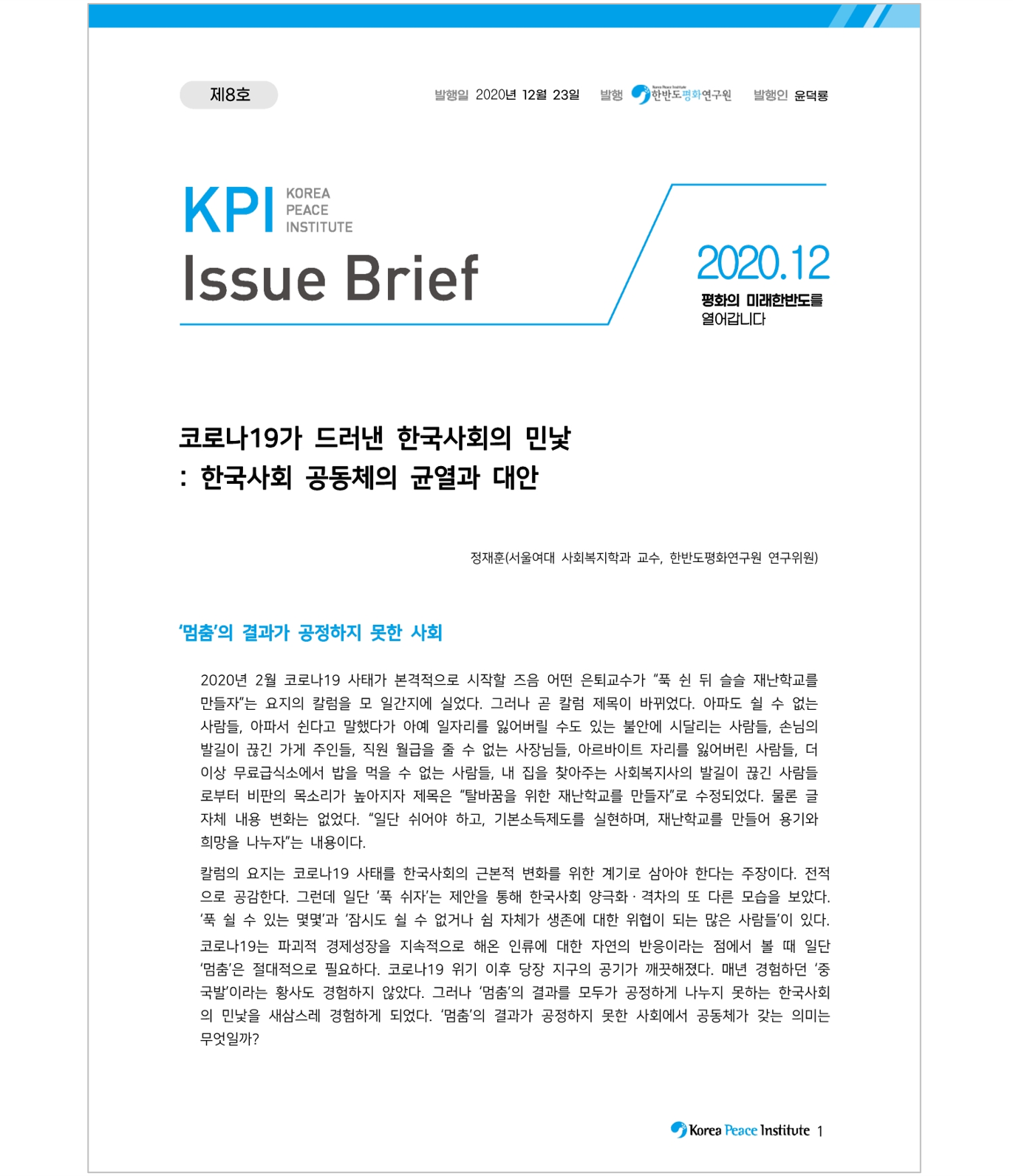 2020년 한 해를 마무리하며 KPI Issue Brief 8호는 정재훈 교수(서울여대 사회복지학)의 기고로 코로나19 상황에서의 한국사회의 복지문제를 살폈습니다.