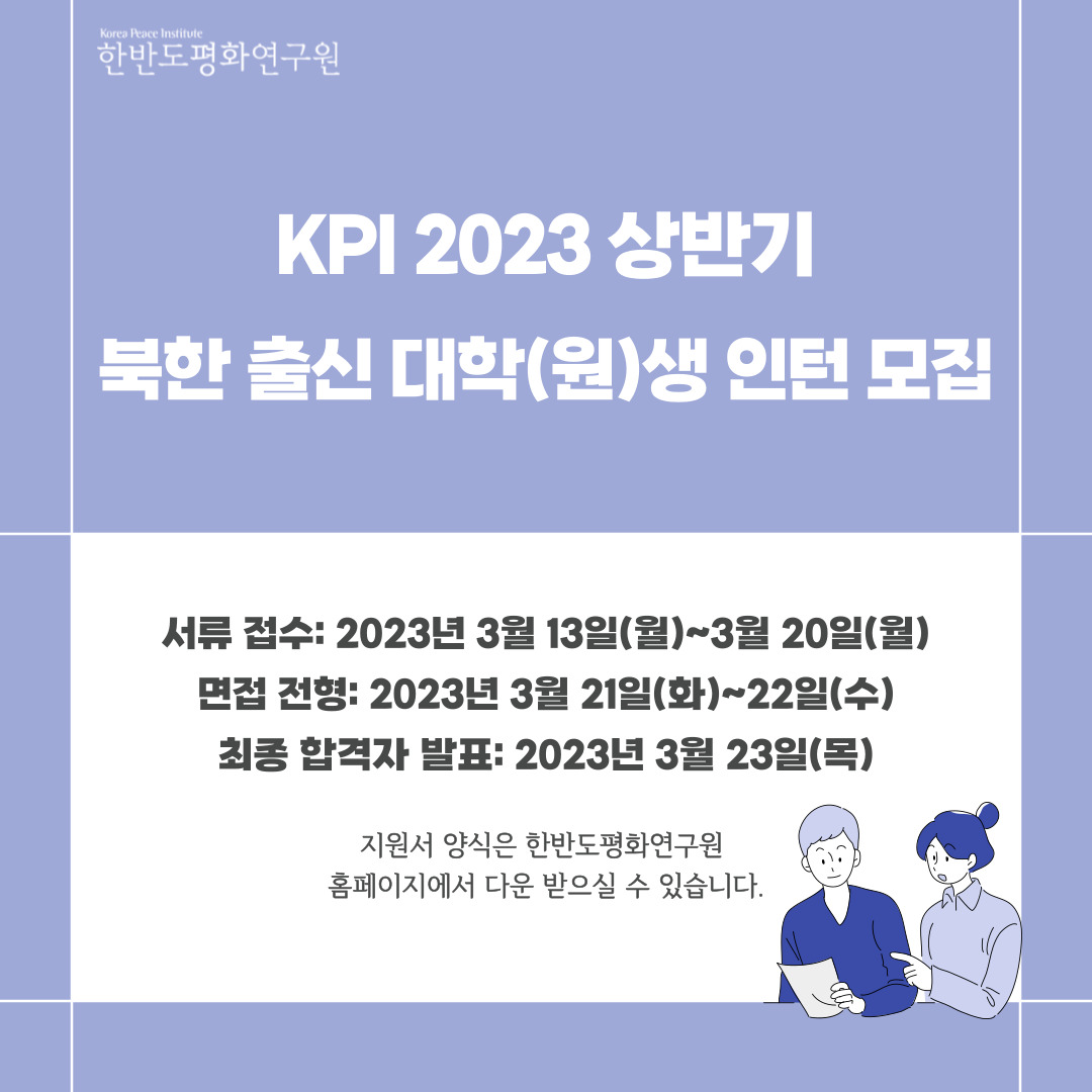 | 제목 | [마감] 한반도평화연구원 2023년 북한 출신 대학(원)생 인턴 채용공고 | ||