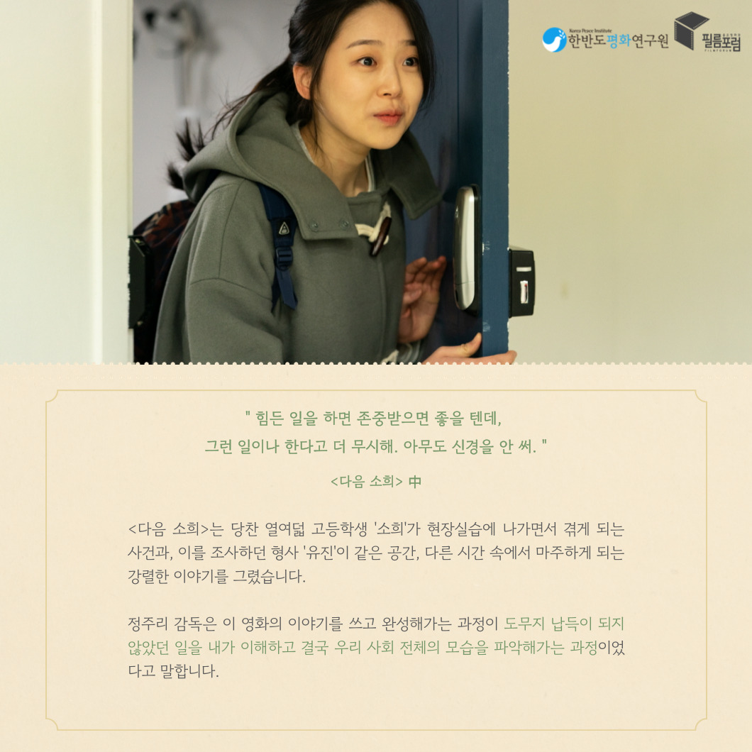 탁월한 리얼리즘으로 한국의 켄로치라는 찬사를 들은 정주리 감독의 영화 <다음 소희>가 우리에게 질문을 건넵니다.