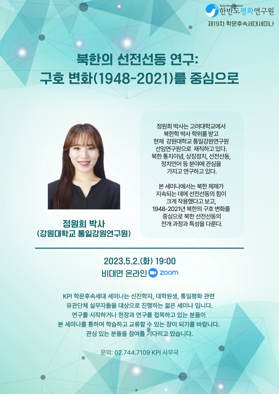 ✔발표자: 정원희 박사(강원대학교 강원통일연구원 선임연구원) ✔일시: 2023.5.2.(화), 19:00 ✔신청: https://forms.gle/YD1zF7guA4avhRpb6 ✔문의: 02.744.7109, 010.7440.7109, kpi@koreapeace.or.kr *KPI 학문후속세대세미나는 크리스천 학자들이 함께하는 내부 세미나로 세미나 앞 시간에 잠시 참가자 근황을 나누고 찬송, 기도하는 시간이 있습니다.