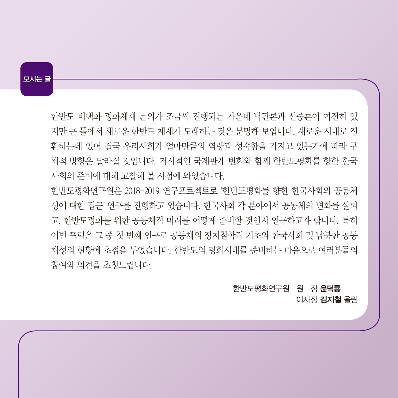 평화와 공동체적 나눔이 충만하여 인권과 자유가 보장되는 하나된 한반도를 열어가는