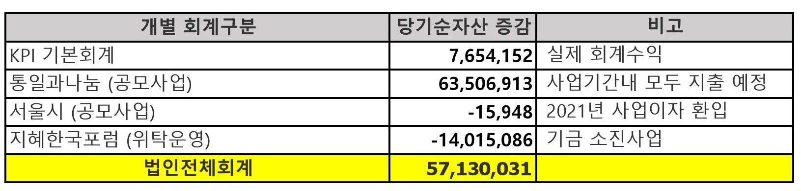 ![]() 법인전체회계에서 2021년도, 2022년도 당기순자산 증감 폭이 크게 다른 이유는 보조금 사업 때문입니다. 보조금 사업이 법인전체 회계 구분 시점(12월말)과 다르기 때문에 보조금 사업에 따라 보조금이 차기년도로 이월되면서 이것이 그대로 법인 회계에 반영되었습니다. 2021년의 경우 –61,284,270원 적자이나 2020년에서 이월된 공모사업비를 2021년에 사용하면서 당기 회계년도 운영성과표에는 큰 적자로 나타났습니다. 반대로 2022년도의 경우 75,130,031원 흑자이나 이 중 63,506,913원은 2023년도 상반기까지 집행 예정인 공모사업비를 이월하기 때문입니다.