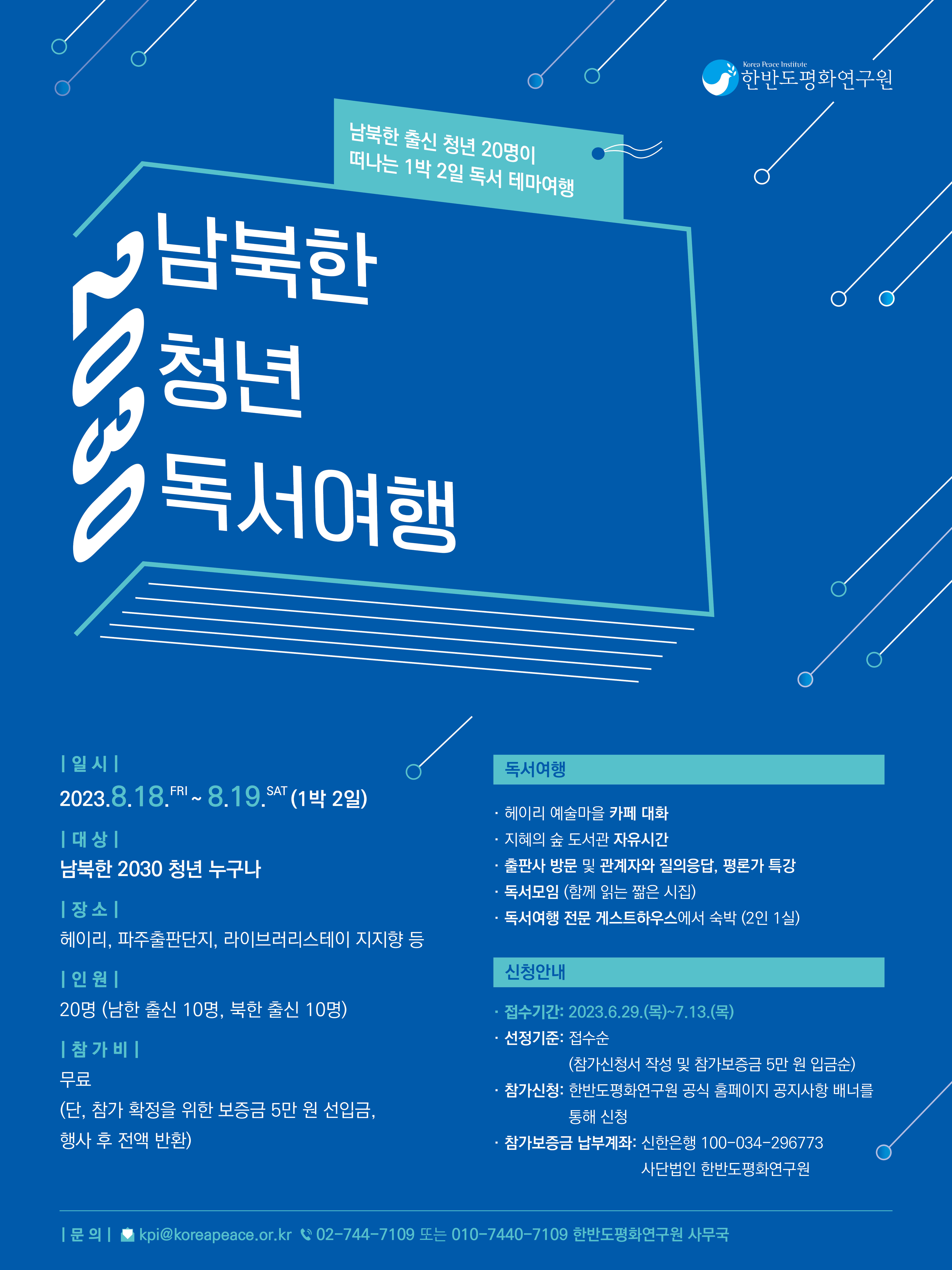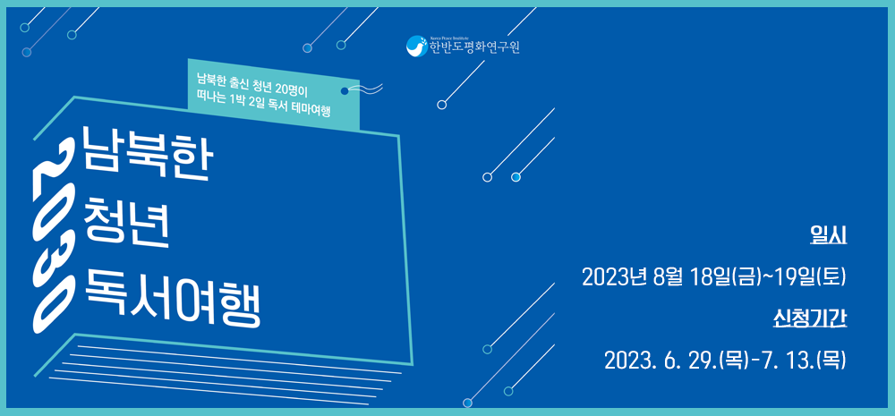한반도평화연구원에서는 독서를 매개로 2030 남북 청년이 함께하는 테마여행을 준비하였습니다. 파주출판단지 견학, 평론가 특강, 출판전문가 만남, 독서모임 등 독서와 연관한 순서로 채운 1박 2일 여행에 책을 사랑하는 남북청년을 초대합니다.