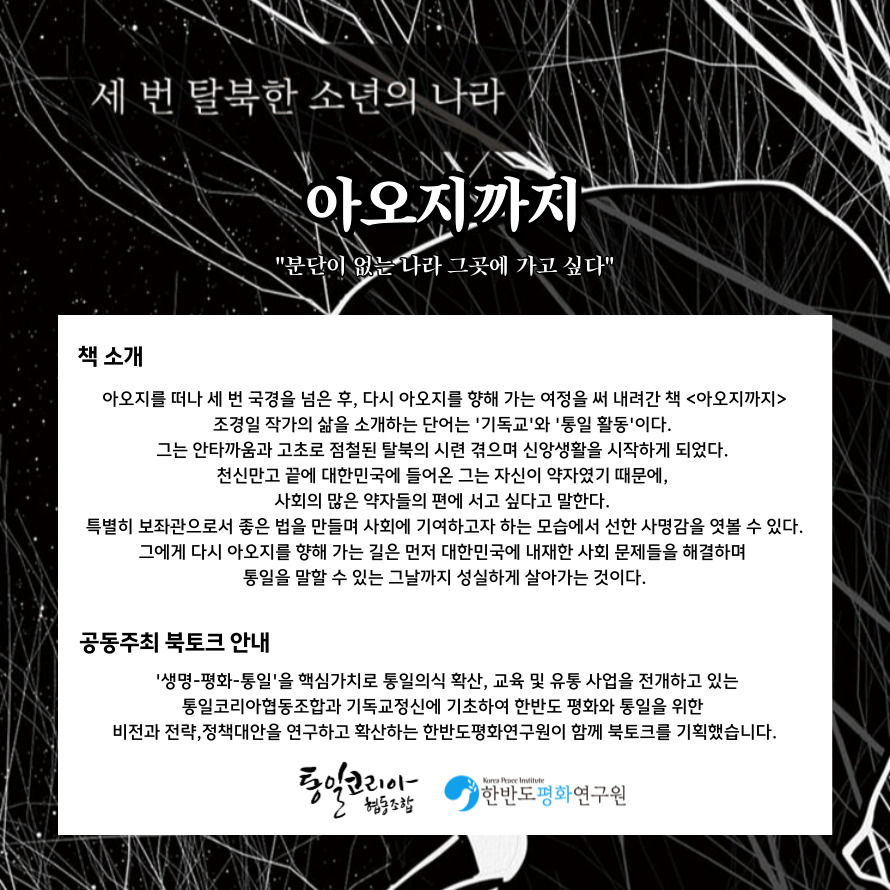 다섯 번째 북토크에는 '아오지까지 ' 저자 조경일 작가를 모십니다. 세 번 탈북한 소년이 성장하여 대한민국 국회에서 일하기까지 소수자의 관점으로 바라보는 대한민국 그리고 통일에 대한 이야기를 독자들과 함께 나누고자 합니다. 조경일 작가가 느낀 다양한 경험과 생각을 독자들과 함께 나누는 본 북토크에 여러분의 따뜻한 관심과 적극적인 참여 부탁드립니다.