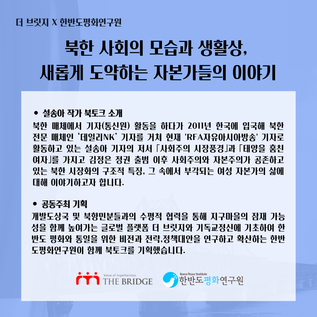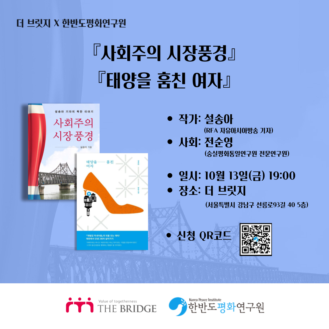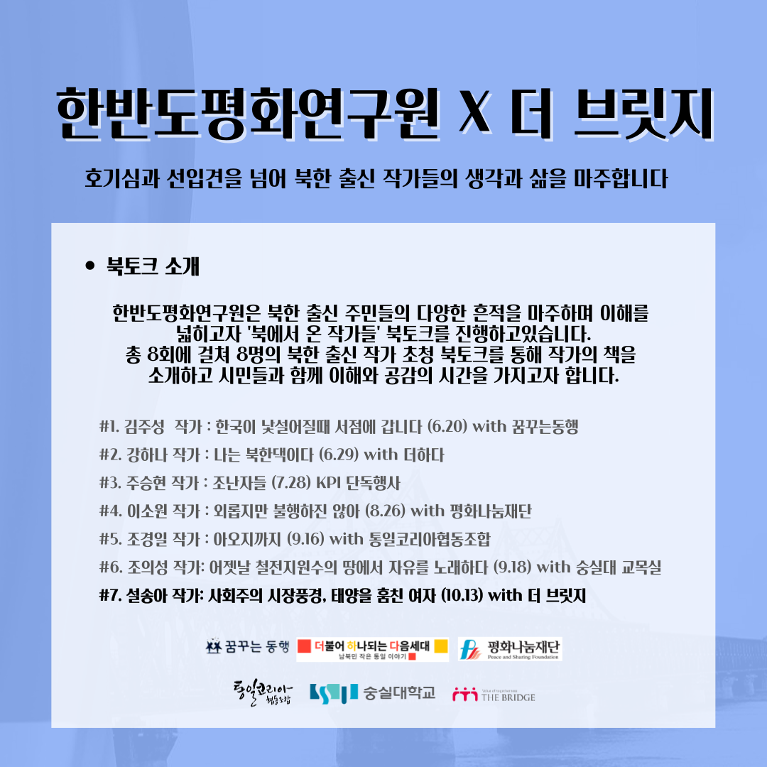 안녕하세요, 더 브릿지 X 한반도평화연구원입니다. 오는 10월 13일(금) 설송아 작가를 모시고 공동 북토크를 기획하여 소개해 드립니다.