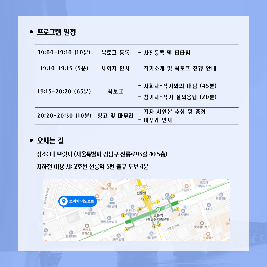 - 장소: 더 브릿지 (서울특별시 강남구 선릉로93길 40 5층)