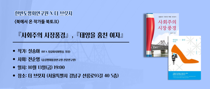 이번 북토크에는 북한 매체에서 기자(통신원) 활동을 하다가 2011년 한국에 입국해 북한 전문 매체인 ‘데일리NK’ 기자를 거쳐 현재 'RFA자유아시아방송' 기자로 활동하고 있는 설송아 기자의 저서 '사회주의 시장풍경'과 신작 '태양을 훔친 여자' 두 권을 가지고 김정은 정권 출범 이후 사회주의와 자본주의가 공존하고 있는 북한 시장화의 구조적 특징, 그 속에서 부각되는 여성 자본가의 삶에 대해 이야기하고자 합니다. 작가가 느낀 다양한 경험과 생각을 독자들과 함께 나누는 본 북토크에 여러분의 따뜻한 관심과 적극적인 참여 부탁드립니다.