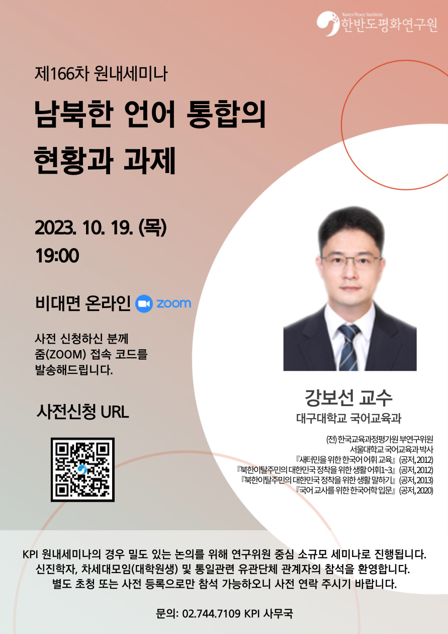 ✔문의: 02-744-7109, 010-7440-7109, kpi@koreapeace.or.kr 한반도평화연구원 사무국 * KPI 원내세미나는 크리스천 학자들이 함께하는 연구위원 중심의 내부 세미나로 세미나 전 잠시 참가자 근황을 나누고 찬송, 기도하는 시간이 있습니다.