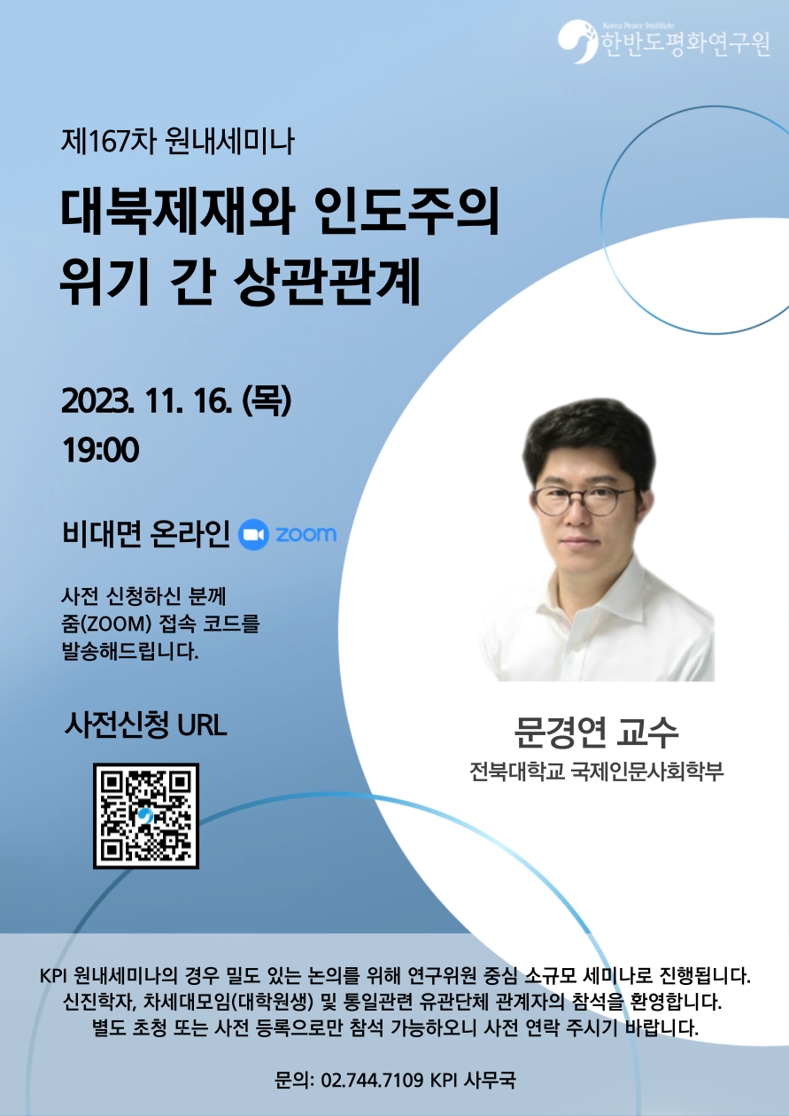 ✔문의: 02-744-7109, 010-7440-7109, kpi@koreapeace.or.kr 한반도평화연구원 사무국 * KPI 원내세미나는 크리스천 학자들이 함께하는 연구위원 중심의 내부 세미나로 세미나 전 잠시 참가자 근황을 나누고 찬송, 기도하는 시간이 있습니다.