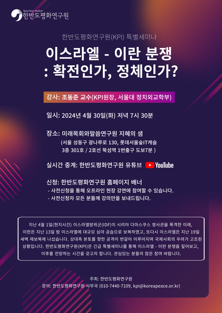 한반도평화연구원(KPI)은 긴급 특별세미나를 통해 이스라엘 - 이란 분쟁을 짚어보고, 이후를 전망하는 갖고자 합니다. 관심있는 분들의 많은 참여 바랍니다.