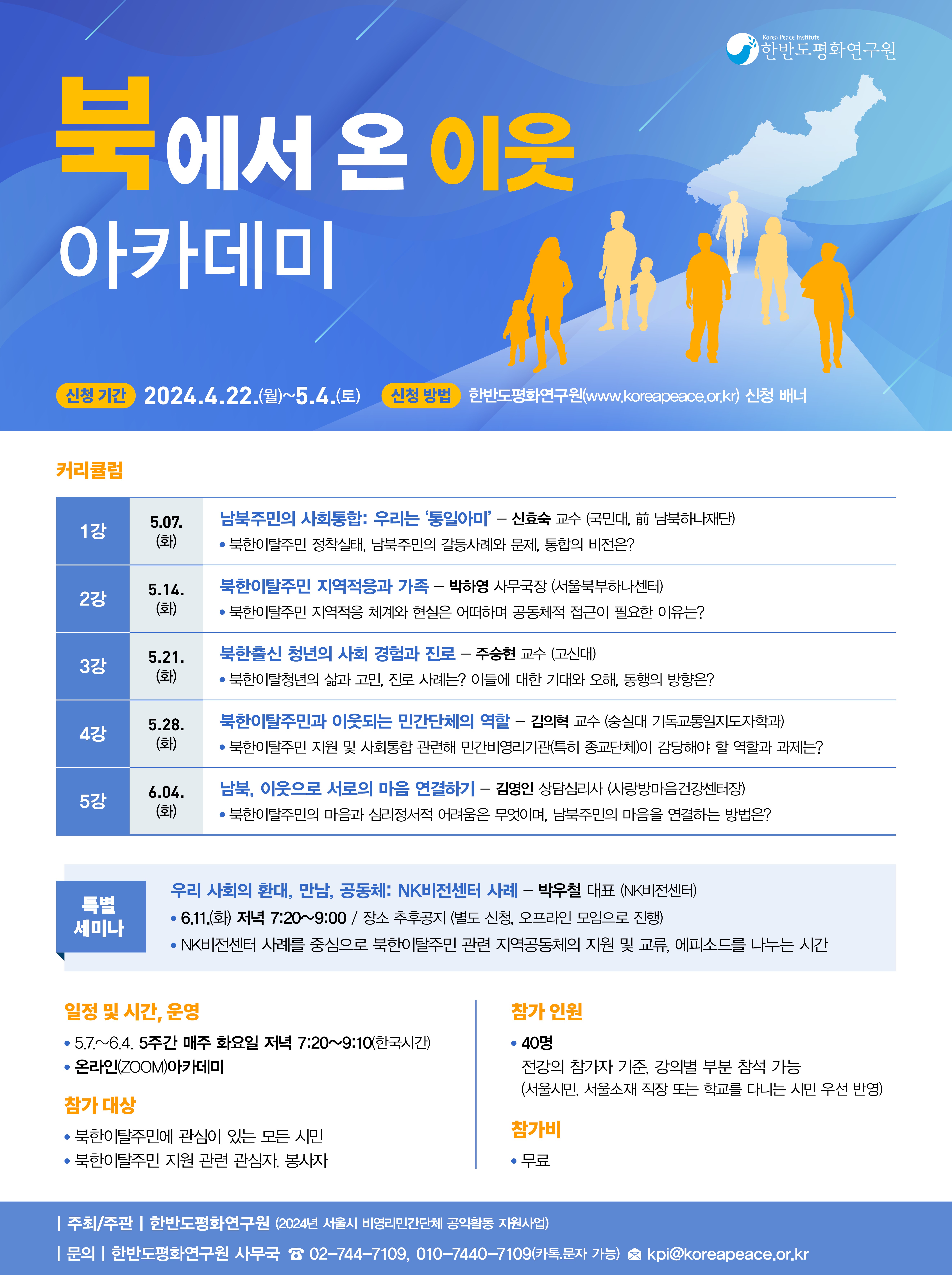✔️대상: 북한이탈주민에 관심이 있는 모든 시민, 북한이탈주민 지원 관련 관심자, 봉사자 ✔️인원: 40명(선착순, 전강의 참가자 기준이며 강의별 부분 추가 참석 가능) ✔️일시: 5/7(화), 14(화), 21(화), 28(화), 6/4(화) 저녁 7:20~9:10(한국시간) ✔️운영: 온라인 비대면 줌(ZOOM) ✔️교육비: 무료 ✔️주최·주관: 한반도평화연구원 ✔️참가신청: 아래 신청링크 클릭 http://forms.gle/Av2XbzDBjJ9pfW6n6 ✔️신청기간: 2024/4/22(월)~5/4(토) - 5.4(토) 신청 마감이나 선착순 접수로 조기 마감될 수 있습니다. |