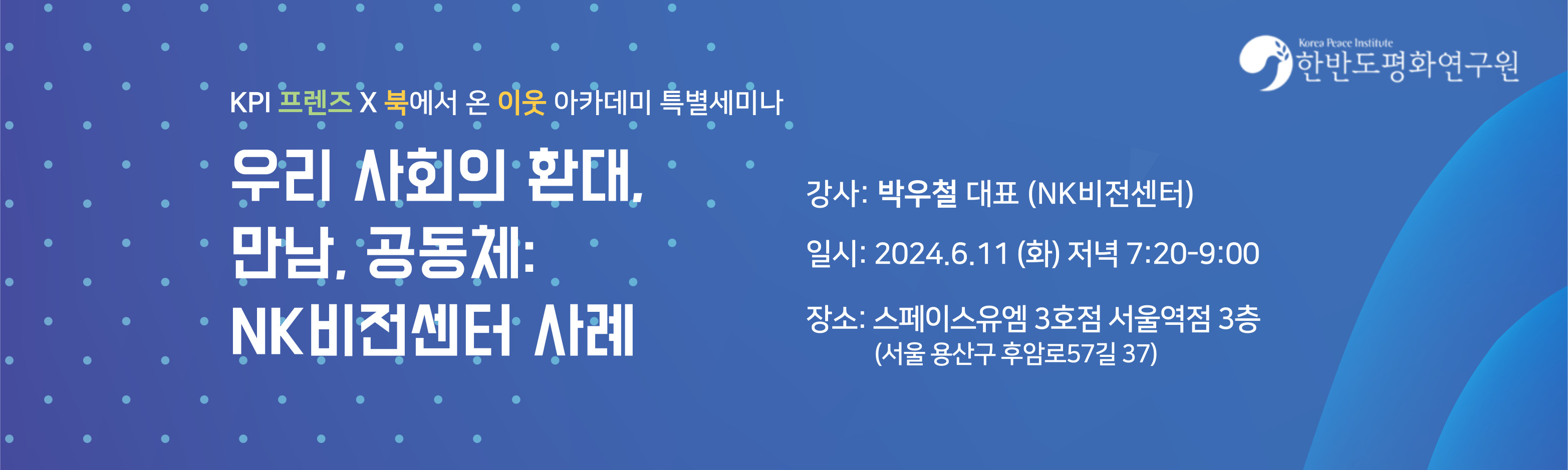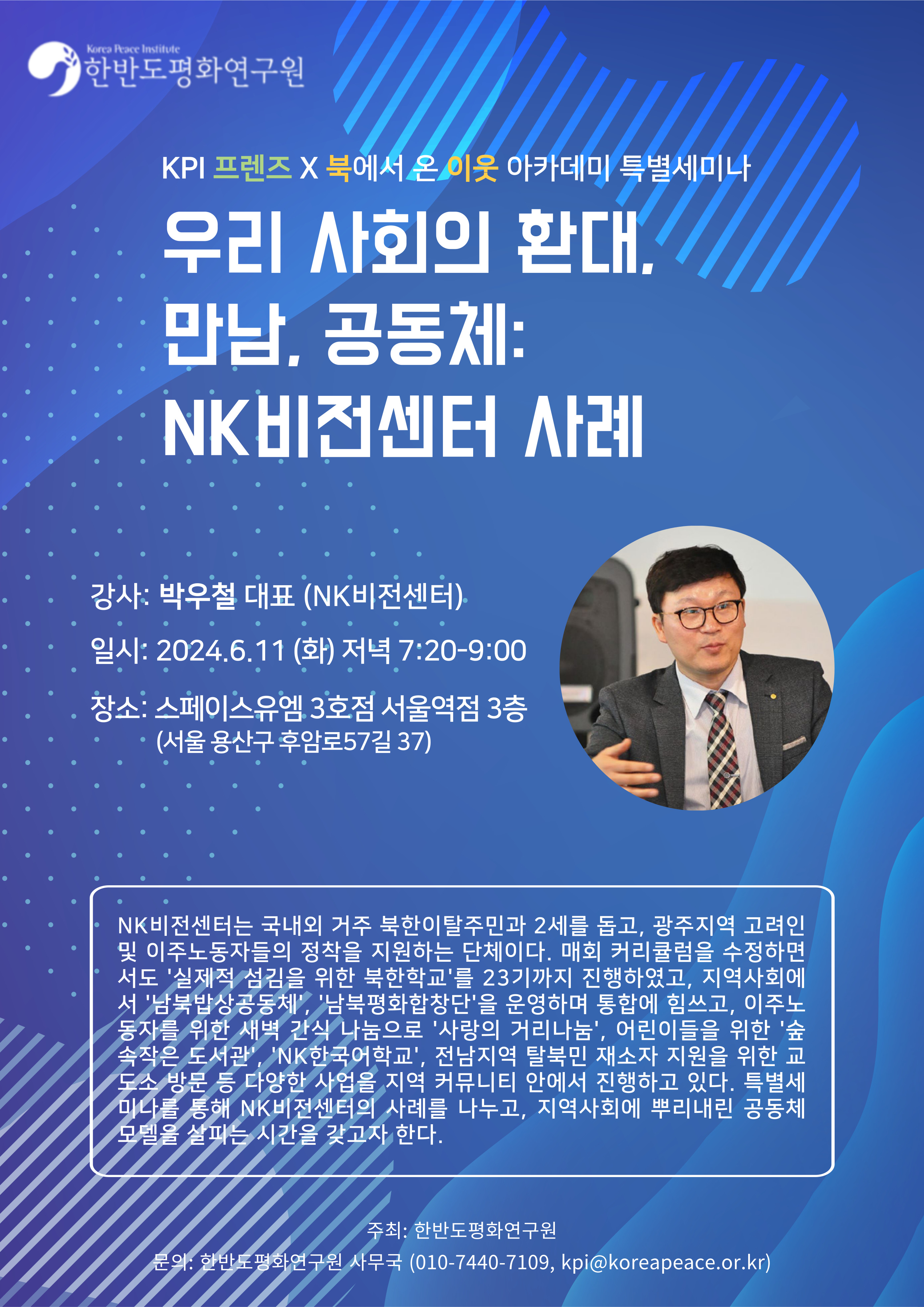 본 연구원은 북한이탈주민에 대해 넓고 깊게 이해하고 이웃으로 함께하며, 우리와 사회 모두를 돌아보기 위해 '북에서 온 이웃 아카데미'(온라인, 5/7화~6/4화)를 개설하여 진행하고 있습니다. 이에 더하여, 지역 커뮤니티에서 북한이탈주민과 이웃되는 구체적고 생생한 사례를 엿보는 특별한 시간을 마련하였습니다. 남북출신 주민이 함께 지역 사회에 뿌리내리는 공동체 모델을 보고 듣는 이 자리에 여러분들을 초대합니다.