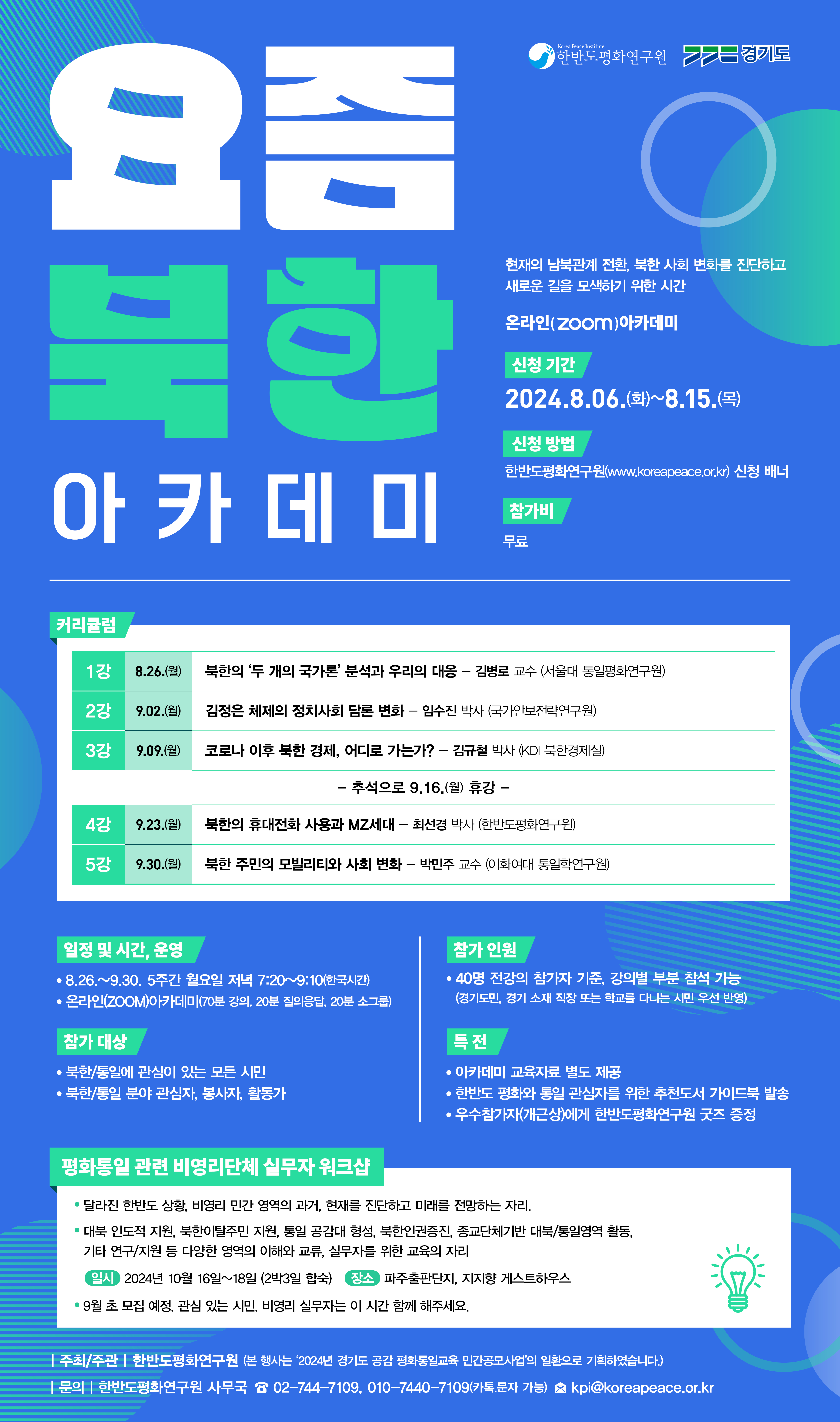 늘 비슷비슷한 북한 개론 강연, 북한 사회의 부분적 단면을 보며주는 강의는 많으나 '현재의 북한'을 전체적으로 조망하는 교육은 많지 않습니다. 한반도 현실을 마주하고 바로 지금의 북한 변화에 대해 알기 원하는 분들을 위한 '요즘 북한 아카데미'를 소개합니다. 지금의 남북한, 변화의 흐름, 새로운 전략을 고민하시는 시민, 관심자, 비영리단체(NPO) 실무자 분들을 초청합니다. 2024년 경기도 공감 평화통일교육 공모사업에 선정되어 진행하는 본 아카데미에 관심있는 모든 분들의 참여를 기다립니다. [요즘북한 아카데미] 안내 ✔️대상: 북한/통일에 관심있는 모든 시민, 북한/통일 분야 관심자, 봉사자, 활동가 ✔️인원: 40명 - 선착순, 전강의 참가자 기준이며 강의별 부분 참석 가능 - 경기도민, 경기 소재 직장 또는 학교를 다니는 시민 우선 반영 ✔️일시: 8.26~9.30 5주간 월요일 저녁 7:20~9:10 (한국시간) (9.16 추석 연휴 휴강) ✔️운영: 온라인 비대면 줌(ZOOM) ✔️교육비: 무료 ✔️주최·주관: 한반도평화연구원 ✔️참가신청: 아래 신청링크 클릭 https://forms.gle/oapVBGaYoLzoPV946 ✔️신청기간: 2024/8/06(화)~8/15(목) - 선착순 접수로 조기 마감될 수 있습니다. ✔️특전 1. 아카데미 교육자료 별도 제공 2. 한반도 평화와 통일 관심자를 위한 추천도서 가이드북 발송 3. 우수참가자(개근상)에게 한하여 한반도평화연구원 굿즈 증정 |