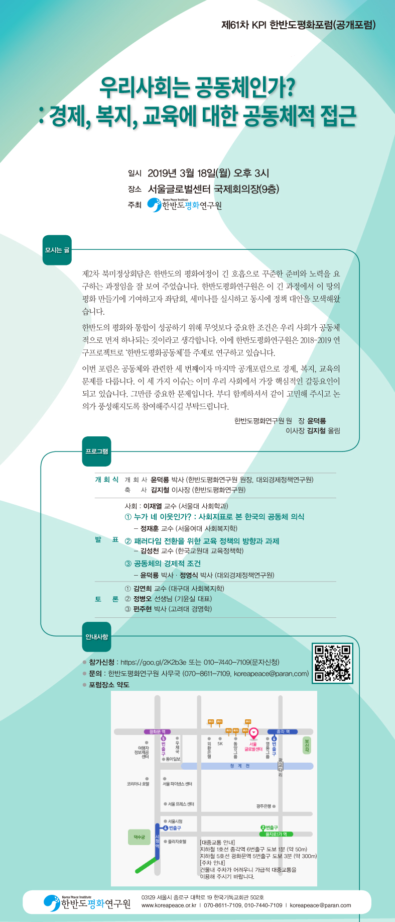 | 제목 | KPI 공개포럼 #61 '우리사회는 공동체인가 : 경제, 복지, 교육에 대한 공동체적 접근' (3/18월 15:00) | ||