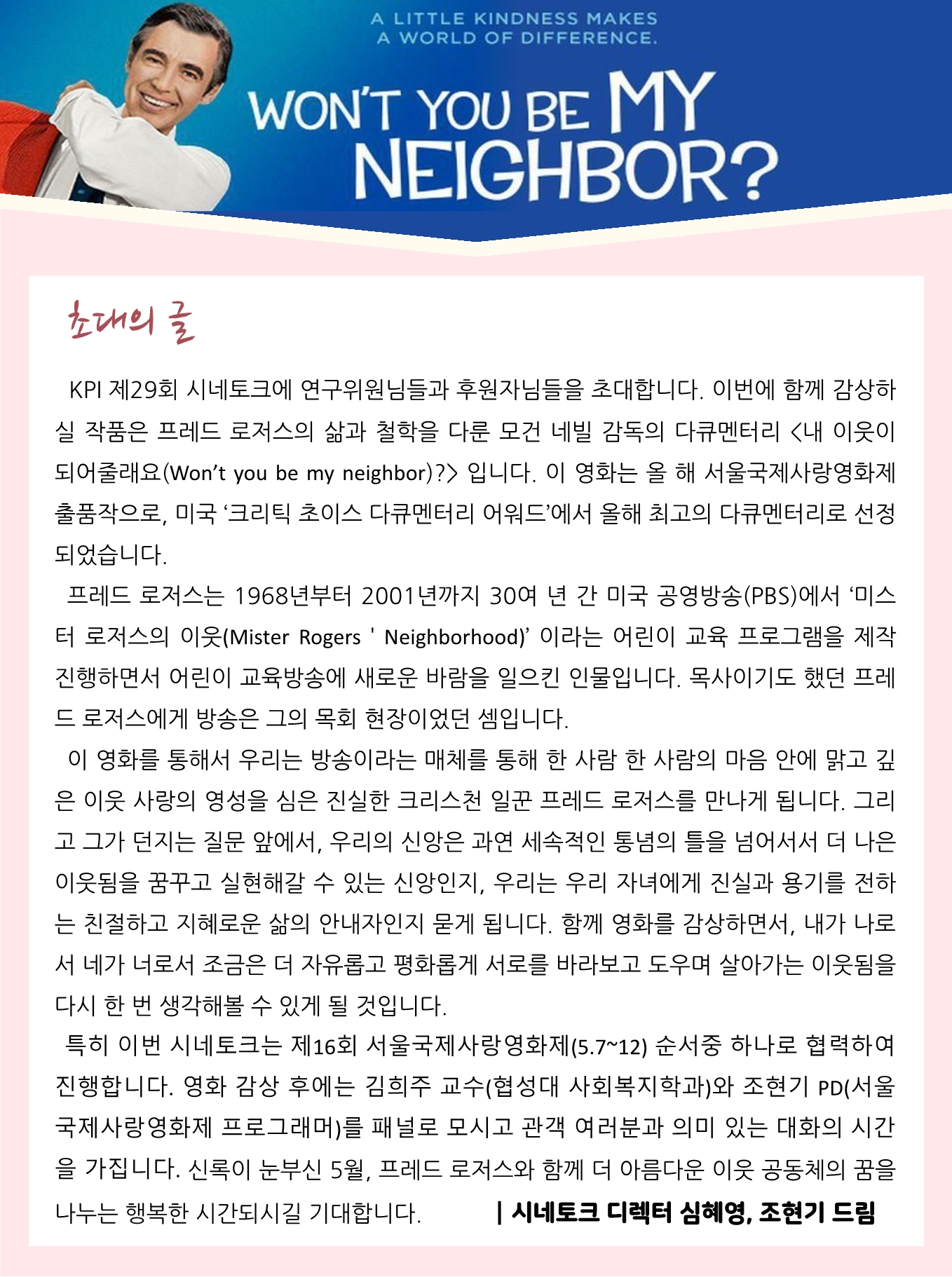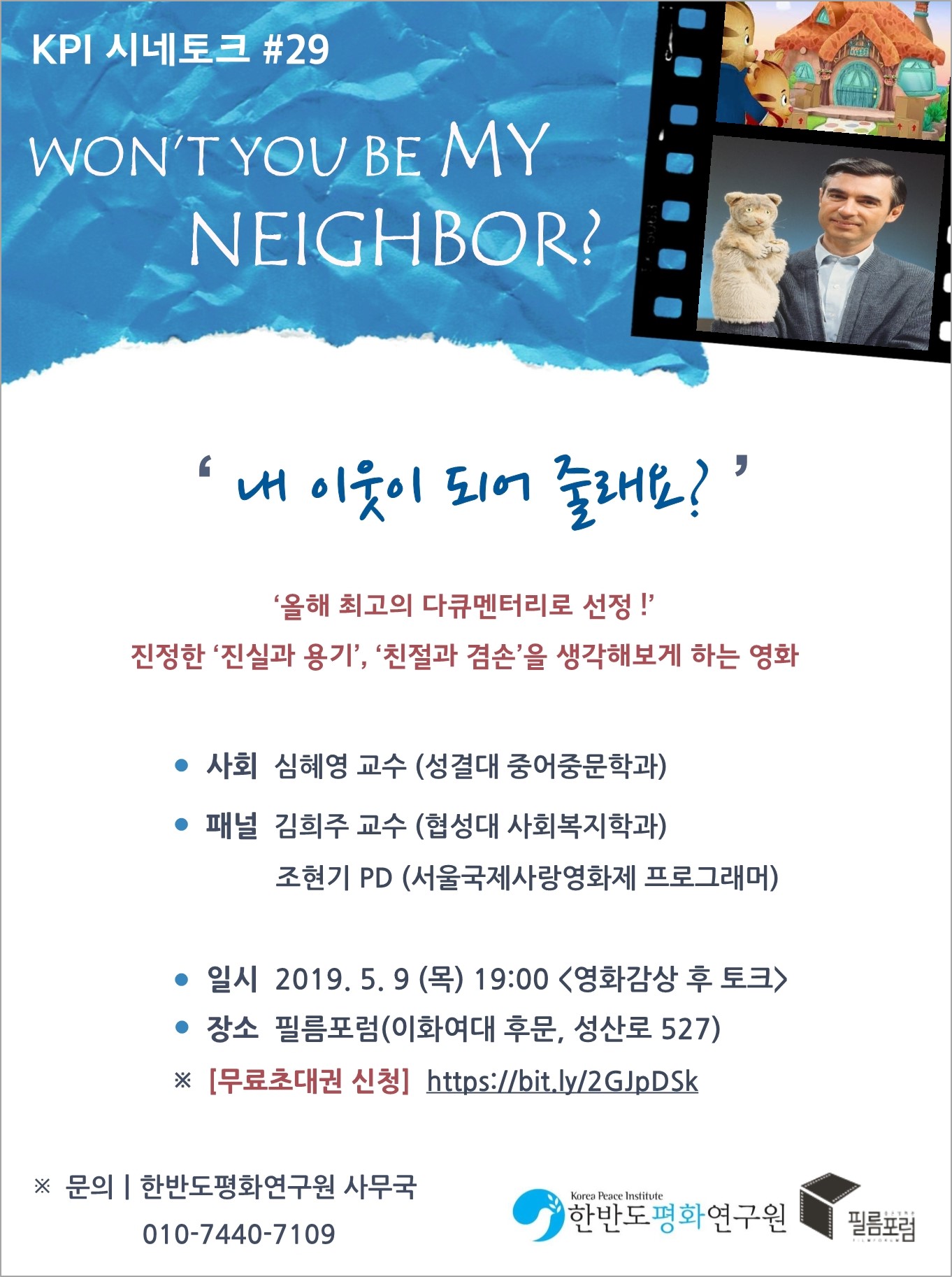 KPI 시네토크 #29 '내 이웃이 되어 줄래요?' (5/9목, 19:00, 필름포럼)