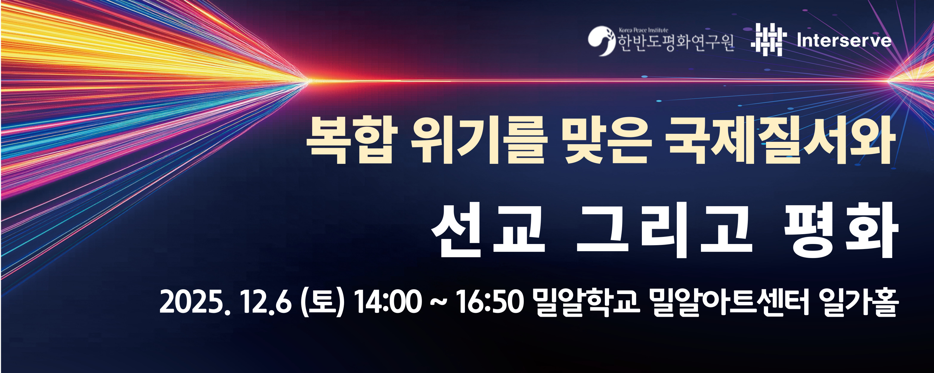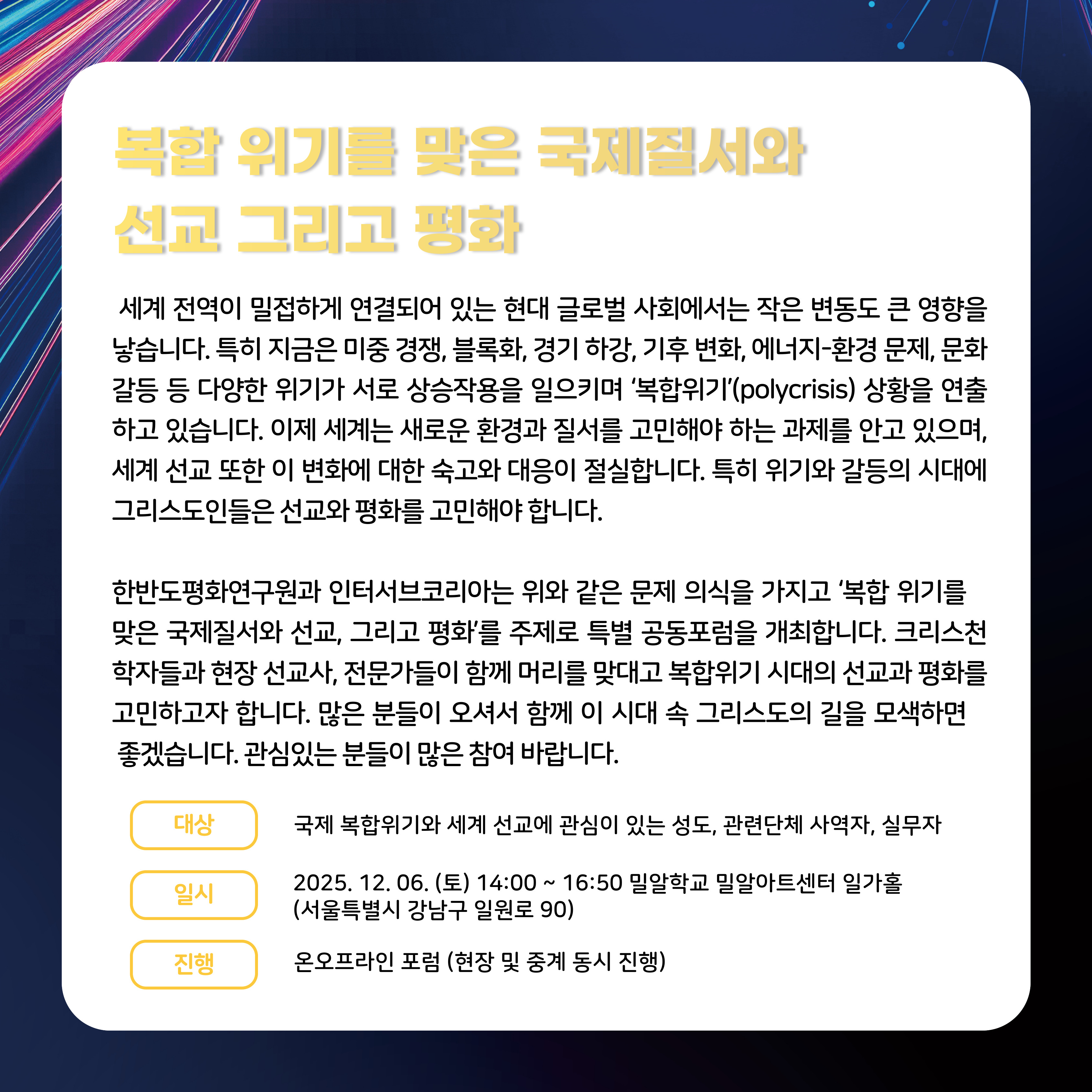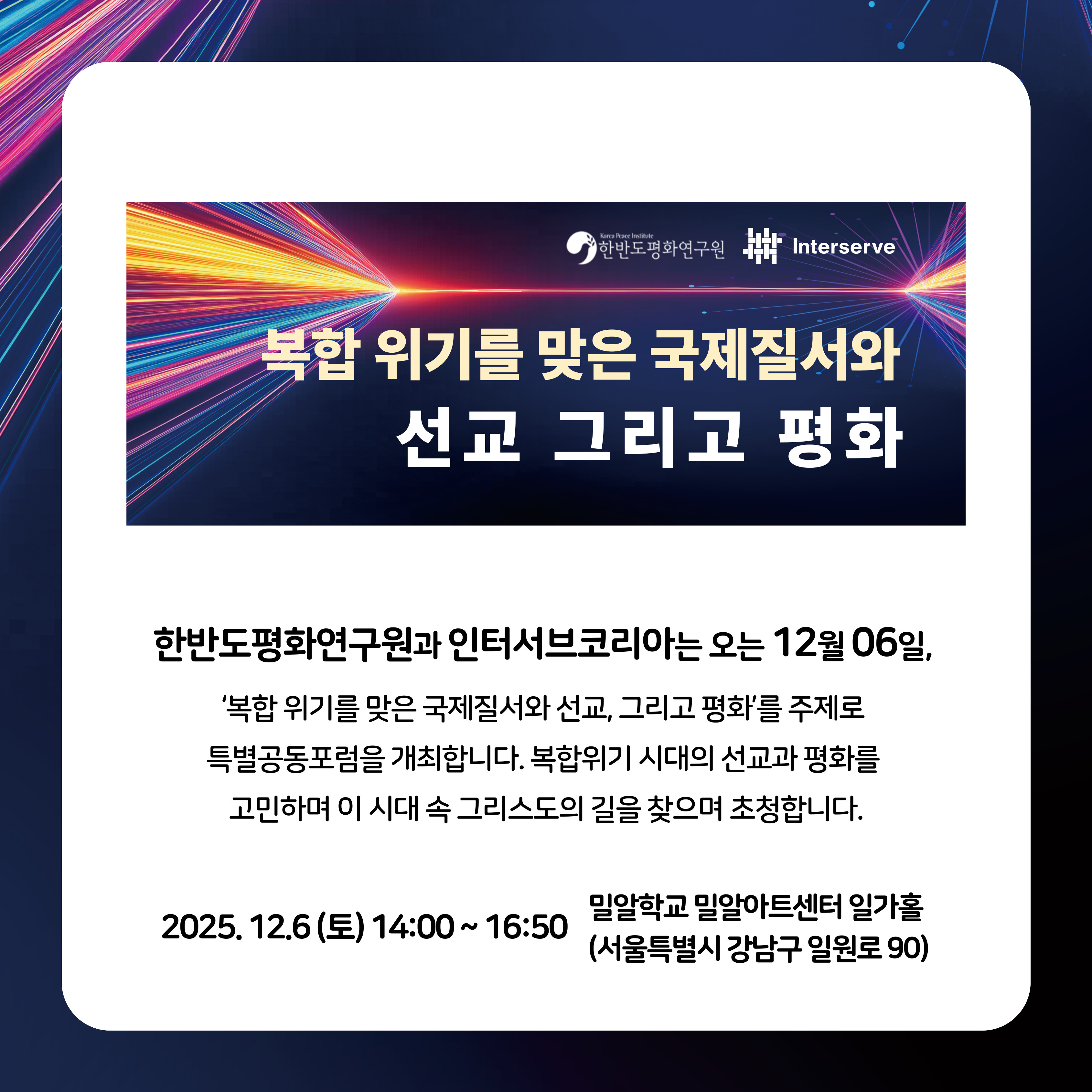 한반도평화연구원과 인터서브코리아는 오는 12월 6일, ‘복합 위기를 맞은 국제질서와 선교, 그리고 평화’를 주제로 특별공동포럼을 개최합니다.