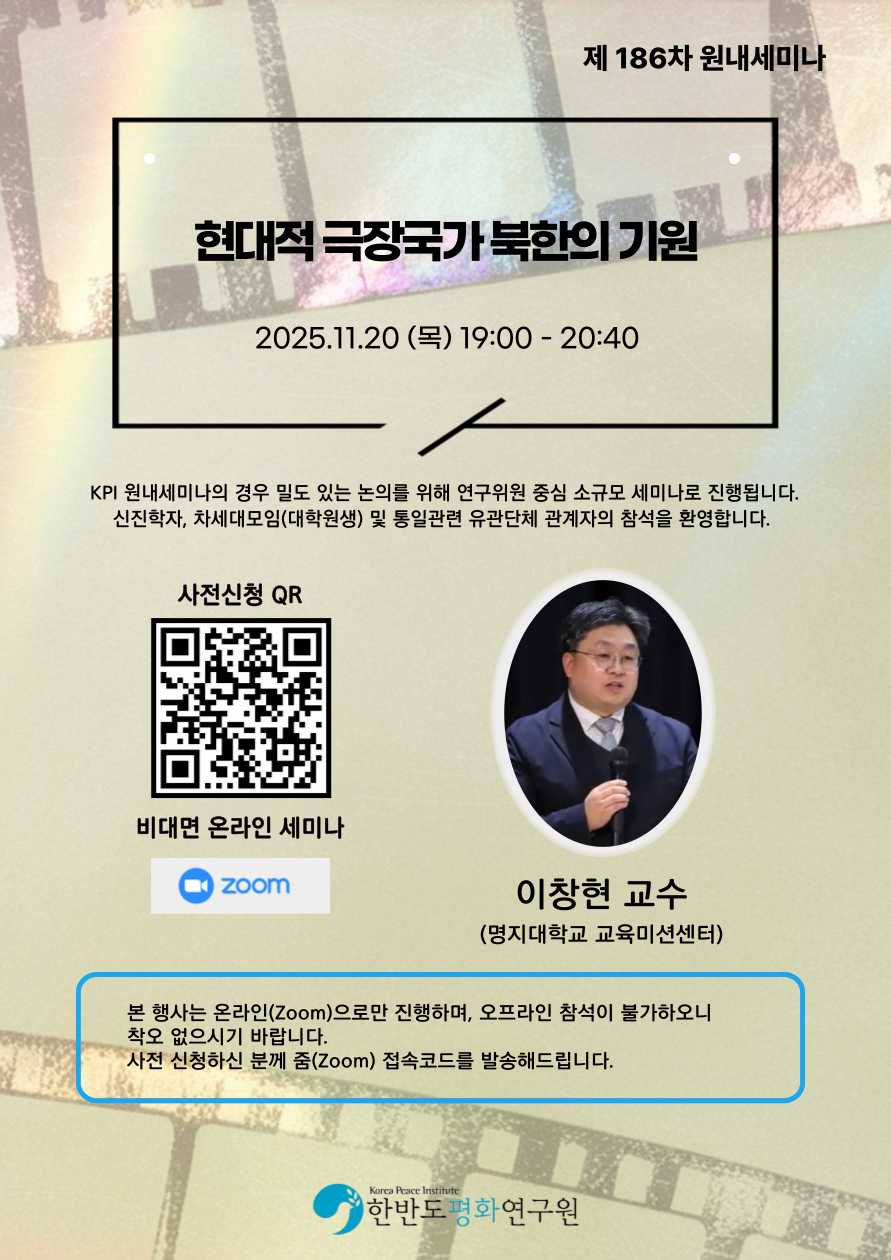 안녕하세요 한반도평화연구원 사무국입니다. 2025년 11월 KPI 원내세미나(제186차)에 여러분들을 초청합니다. 관심있는 분들의 많은 참여 바랍니다.