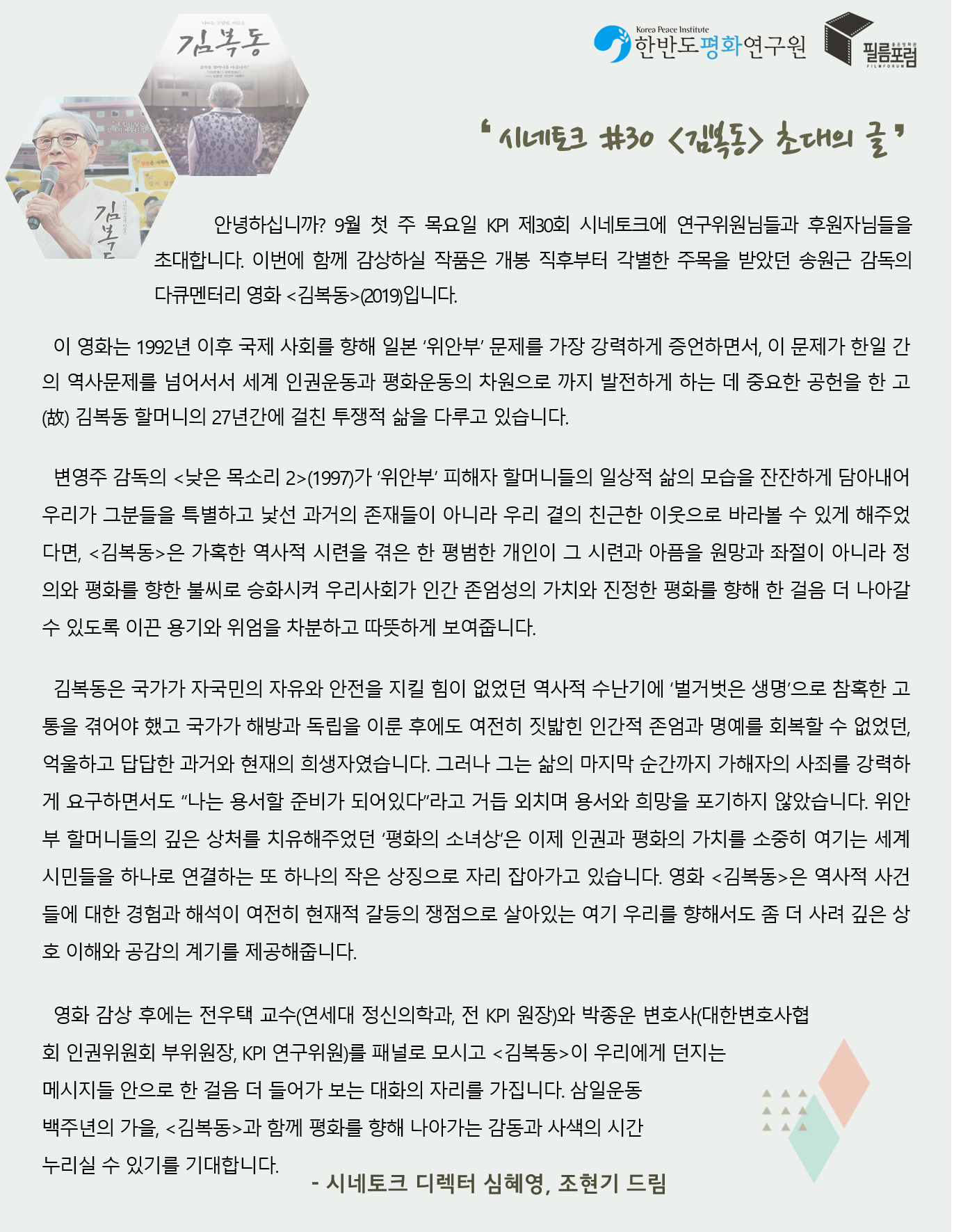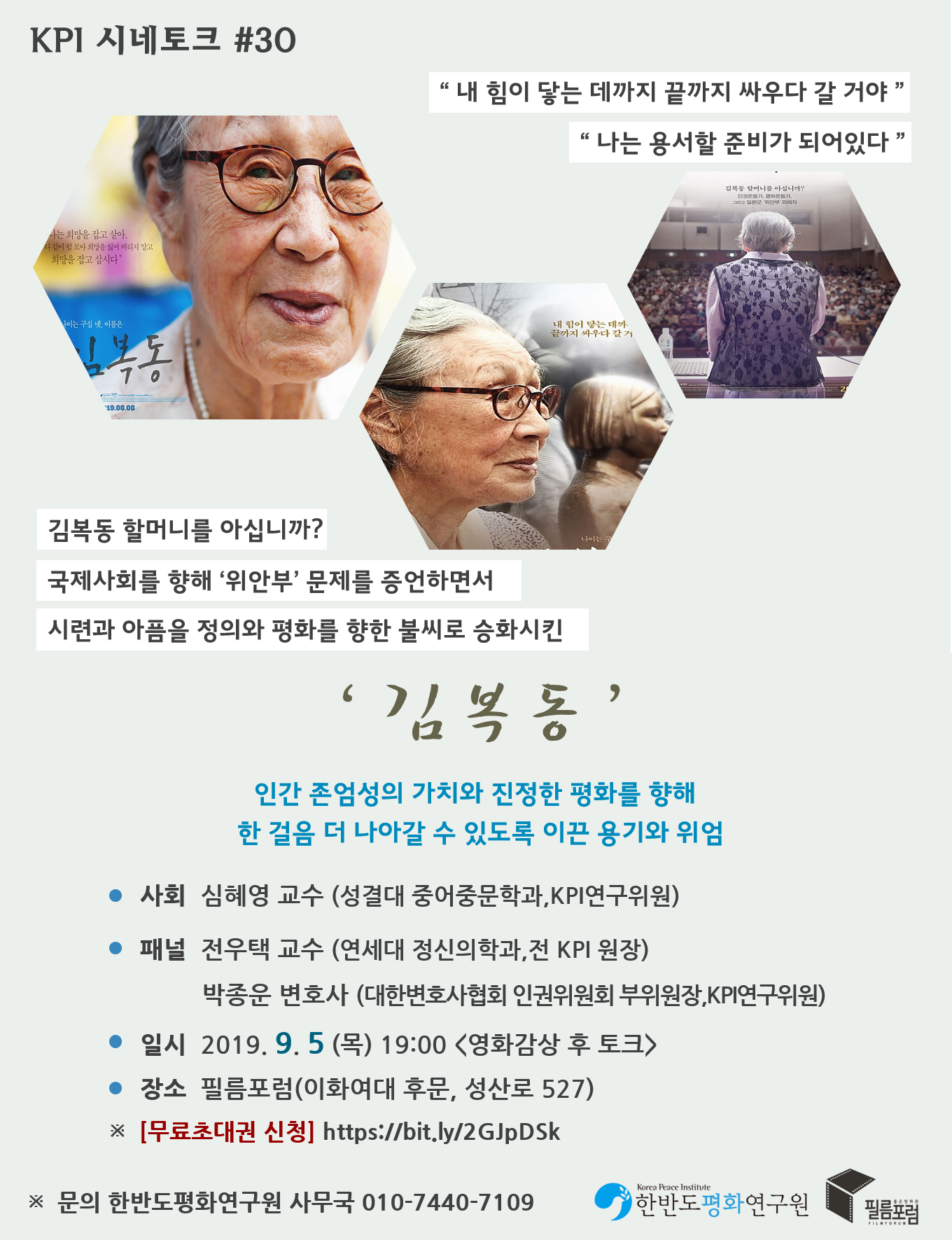 KPI 시네토크#30 '김복동' (9/5목, 19:00, 필름포럼)