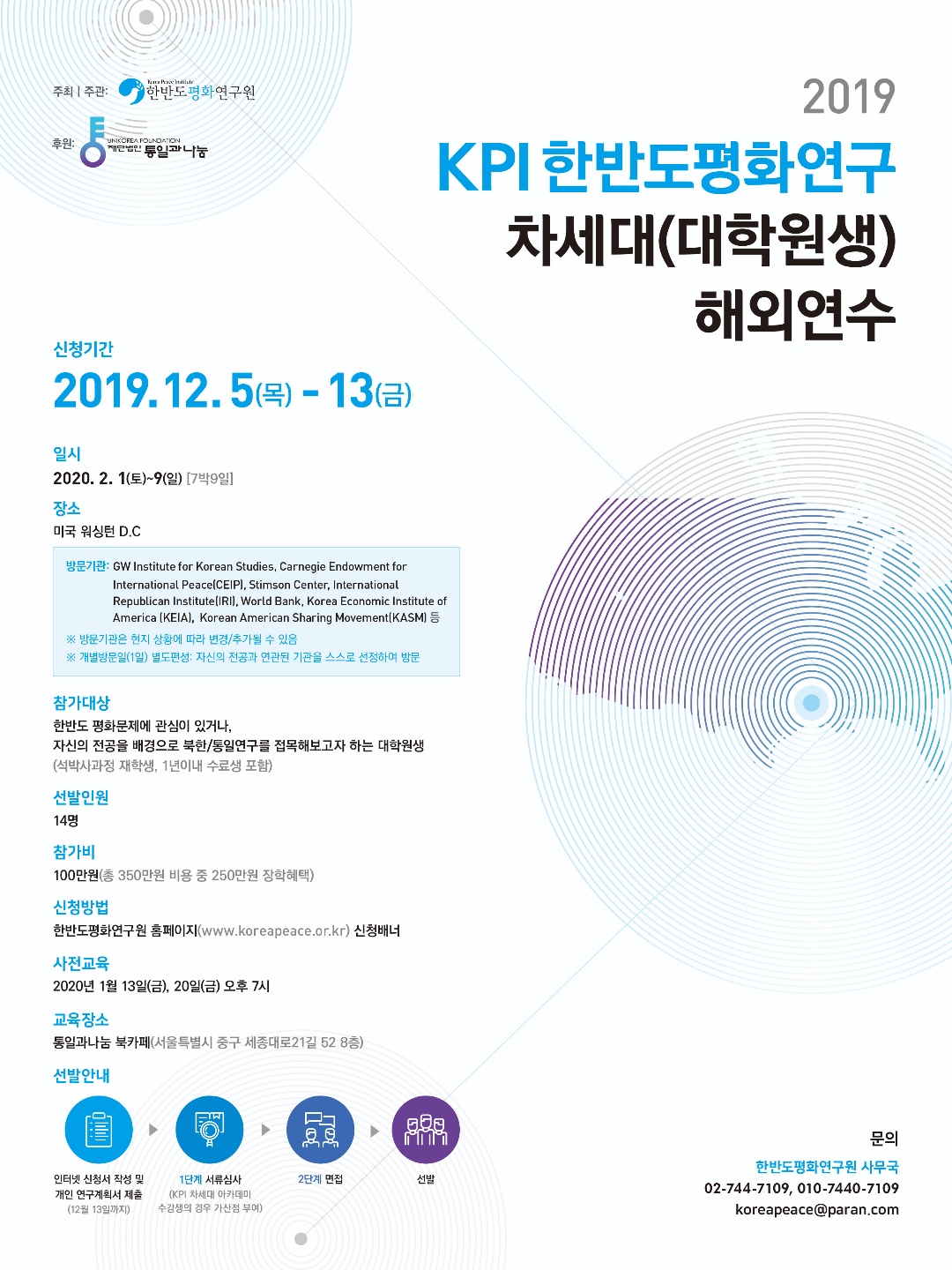 | 제목 | [마감] 2019 KPI 한반도평화연구 차세대(대학원생) Washington D.C. 해외연수 참가자 모집 | ||