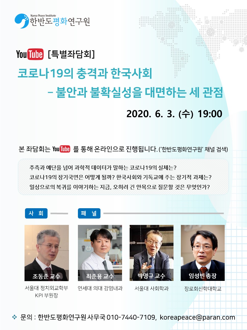 KPI 특별좌담회 유튜브 공개 6/3(수) 19:00 '코로나19의 충격과 한국사회-불안과 불확실성을 대면하는