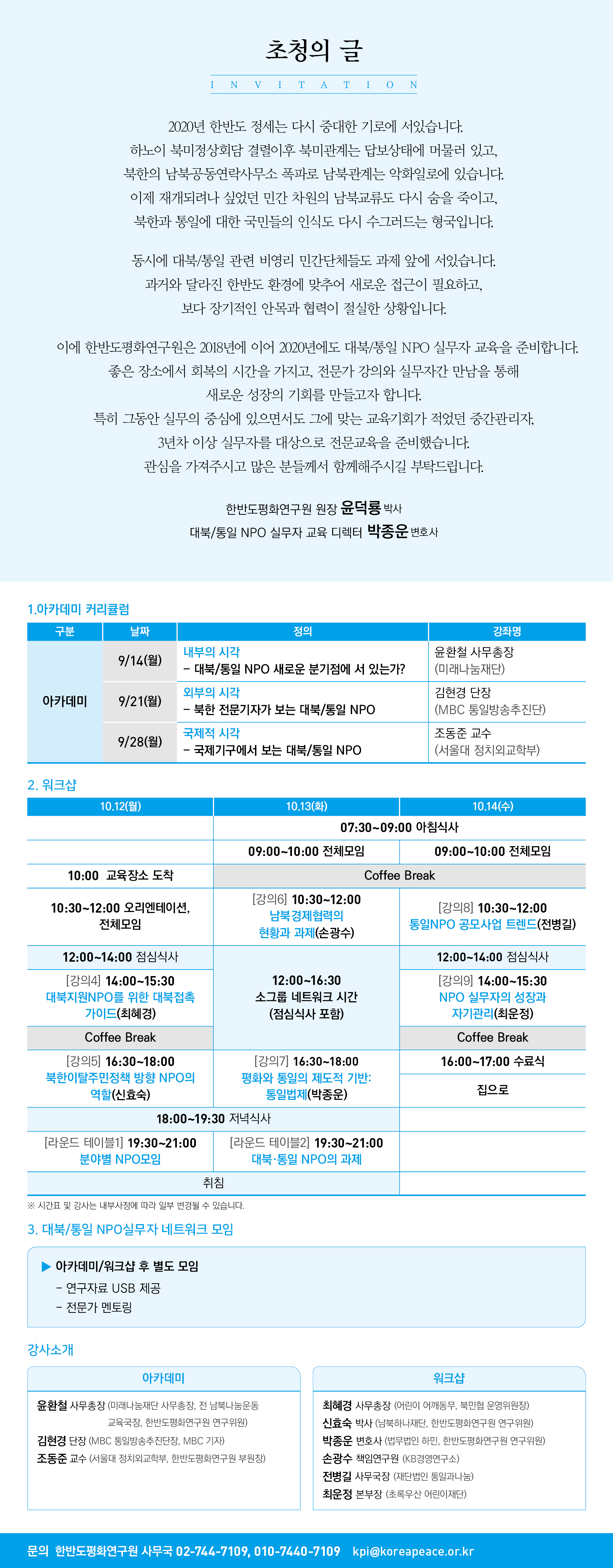 이번 2020 KPI 대북/통일NPO 교육에 관심가져 주신 모든 분들께 인사드립니다. 특히 코로나19 재확산으로 전국이 어려운 지금 모든 분들의 안녕을 기원합니다.