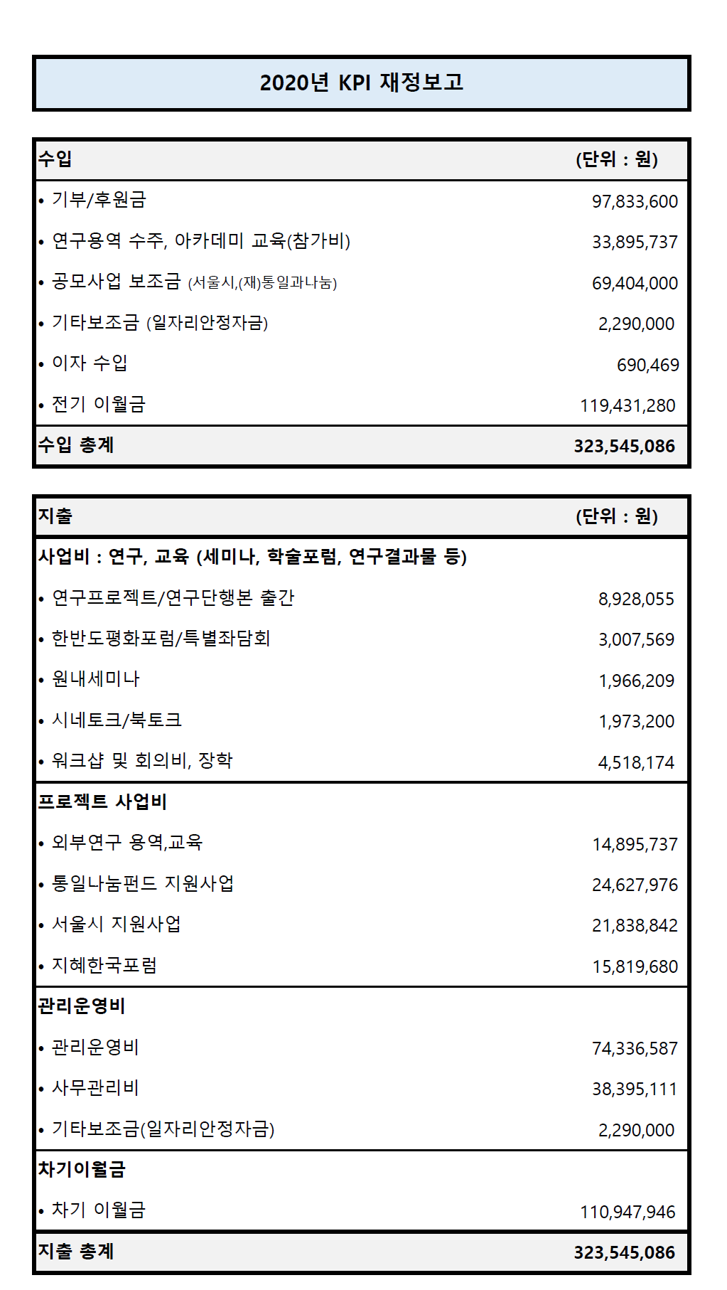 | 제목 | 한반도평화연구원 2020년도 기부금모금액 및 활용실적 명세서, 공익법인 결산서류 등 공시 및 재정 보고 |