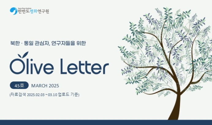 ![]() ▍KPI OLIVE LETTER는 연구자 및 학술 관심자를 위해 북한 ∙ 통일 분야 학술논문, 한반도 관련 주요 언론기사, 학술회의 영상, 단행본 신간 등 연구자에게 필요한 자료와 소식을 알려드리는 한반도평화연구원의 월간 뉴스레터 서비스입니다.