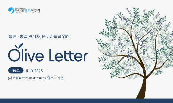 ▍KPI OLIVE LETTER는 연구자 및 학술 관심자를 위해 북한 ∙ 통일 분야 학술논문, 한반도 관련 주요 언론기사, 학술회의 영상, 단행본 신간 등 연구자에게 필요한 자료와 소식을 알려드리는 한반도평화연구원의 월간 뉴스레터 서비스입니다.
